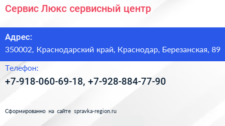 Сервис Люкс, сервисный центр по адресу 350002, Краснодарский край, Краснодар, Березанская, 89 в дальнейшем Организация, размещена в следующих категориях: