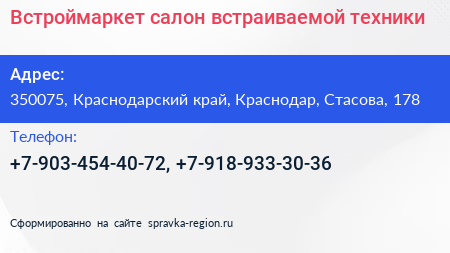 Встроймаркет, салон встраиваемой техники по адресу 350075, Краснодарский край, Краснодар, Стасова, 178 в дальнейшем Организация, размещена в следующих категориях: