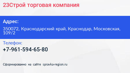 23Строй, торговая компания по адресу 350072, Краснодарский край, Краснодар, Московская, 109/2 в дальнейшем Организация, размещена в следующих категориях: