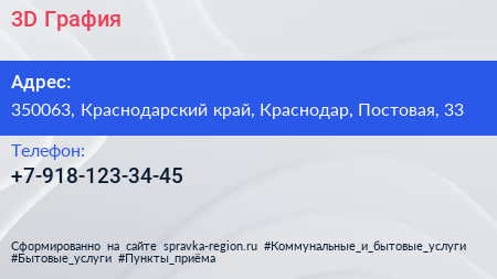 3D Графия по адресу 350063, Краснодарский край, Краснодар, Постовая, 33 в дальнейшем Организация, размещена в следующих категориях: