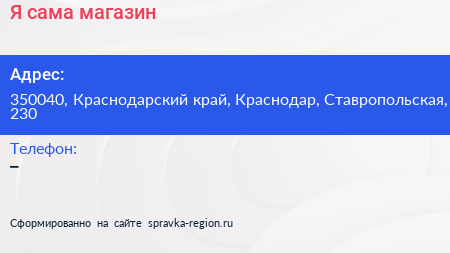 Я сама, магазин по адресу 350040, Краснодарский край, Краснодар, Ставропольская, 230 в дальнейшем Организация, размещена в следующих категориях: