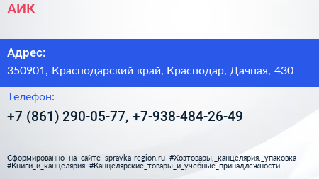 АИК по адресу 350901, Краснодарский край, Краснодар, Дачная, 430 в дальнейшем Организация, размещена в следующих категориях: