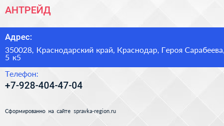 АНТРЕЙД по адресу 350028, Краснодарский край, Краснодар, Героя Сарабеева, 5 к5 в дальнейшем Организация, размещена в следующих категориях: