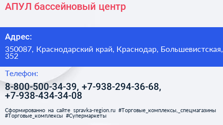 АПУЛ, бассейновый центр по адресу 350087, Краснодарский край, Краснодар, Большевистская, 352 в дальнейшем Организация, размещена в следующих категориях: