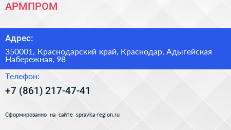АРМПРОМ по адресу 350001, Краснодарский край, Краснодар, Адыгейская Набережная, 98 в дальнейшем Организация, размещена в следующих категориях: