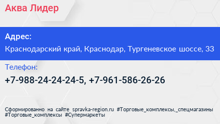 Аква Лидер по адресу Краснодарский край, Краснодар, Тургеневское шоссе, 33 в дальнейшем Организация, размещена в следующих категориях: