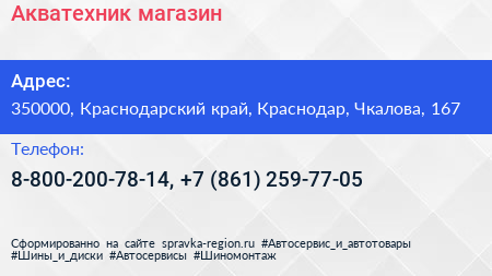 Акватехник, магазин по адресу 350000, Краснодарский край, Краснодар, Чкалова, 167 в дальнейшем Организация, размещена в следующих категориях:
