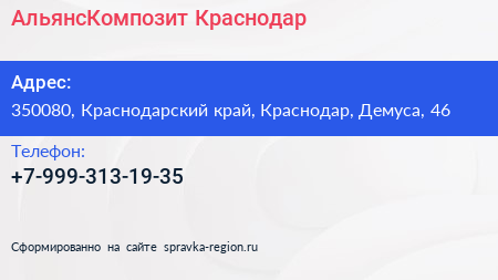 АльянсКомпозит Краснодар по адресу 350080, Краснодарский край, Краснодар, Демуса, 46 в дальнейшем Организация, размещена в следующих категориях: