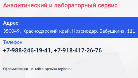 Аналитический и лабораторный сервис по адресу 350049, Краснодарский край, Краснодар, Бабушкина, 111 в дальнейшем Организация, размещена в следующих категориях: