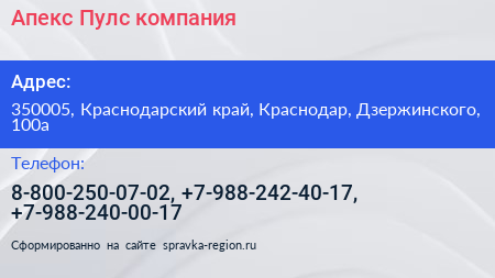 Апекс Пулс, компания по адресу 350005, Краснодарский край, Краснодар, Дзержинского, 100а в дальнейшем Организация, размещена в следующих категориях: