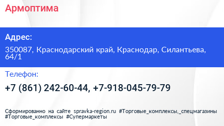 Армоптима по адресу 350087, Краснодарский край, Краснодар, Силантьева, 64/1 в дальнейшем Организация, размещена в следующих категориях: