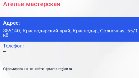 Ателье-мастерская по адресу 385140, Краснодарский край, Краснодар, Солнечная, 55/1 к8 в дальнейшем Организация, размещена в следующих категориях: