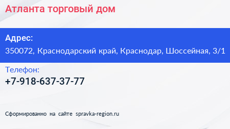 Атланта, торговый дом по адресу 350072, Краснодарский край, Краснодар, Шоссейная, 3/1 в дальнейшем Организация, размещена в следующих категориях: