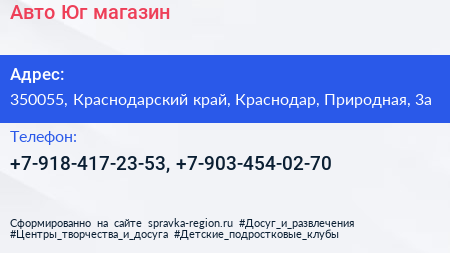 Авто Юг, магазин по адресу 350055, Краснодарский край, Краснодар, Природная, 3а в дальнейшем Организация, размещена в следующих категориях:
