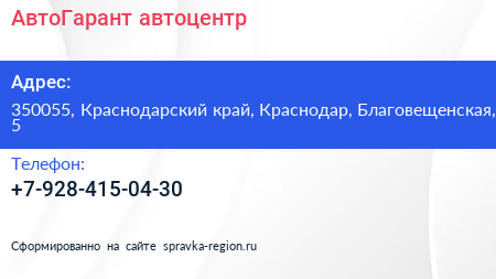 АвтоГарант, автоцентр по адресу 350055, Краснодарский край, Краснодар, Благовещенская, 5 в дальнейшем Организация, размещена в следующих категориях: