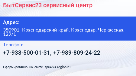 БытСервис23, сервисный центр по адресу 350901, Краснодарский край, Краснодар, Черкасская, 129/1 в дальнейшем Организация, размещена в следующих категориях: