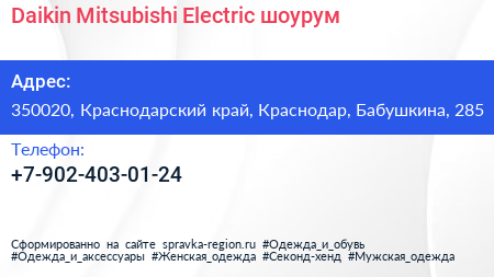 Daikin & Mitsubishi Electric, шоурум по адресу 350020, Краснодарский край, Краснодар, Бабушкина, 285 в дальнейшем Организация, размещена в следующих категориях: