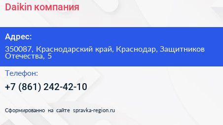 Daikin, компания по адресу 350087, Краснодарский край, Краснодар, Защитников Отечества, 5 в дальнейшем Организация, размещена в следующих категориях: