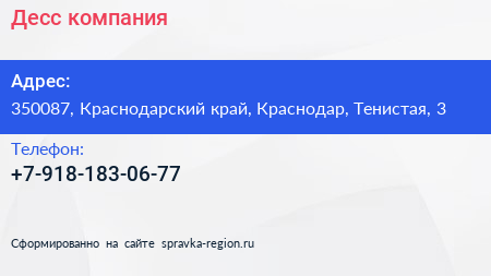 Десс, компания по адресу 350087, Краснодарский край, Краснодар, Тенистая, 3 в дальнейшем Организация, размещена в следующих категориях: