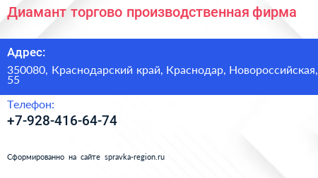 Диамант, торгово-производственная фирма по адресу 350080, Краснодарский край, Краснодар, Новороссийская, 55 в дальнейшем Организация, размещена в следующих категориях: