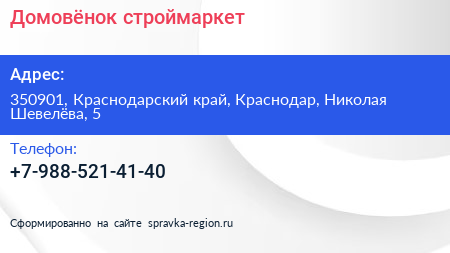 Домовёнок, строймаркет по адресу 350901, Краснодарский край, Краснодар, Николая Шевелёва, 5 в дальнейшем Организация, размещена в следующих категориях: