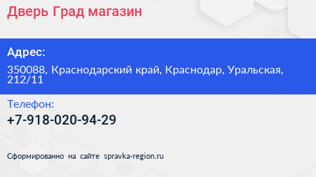 Дверь Град, магазин по адресу 350088, Краснодарский край, Краснодар, Уральская, 212/11 в дальнейшем Организация, размещена в следующих категориях: