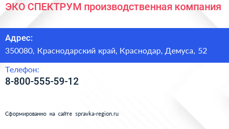 ЭКО-СПЕКТРУМ, производственная компания по адресу 350080, Краснодарский край, Краснодар, Демуса, 52 в дальнейшем Организация, размещена в следующих категориях: