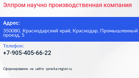 Элпром, научно-производственная компания по адресу 350080, Краснодарский край, Краснодар, Промышленный проезд, 5 в дальнейшем Организация, размещена в следующих категориях:
