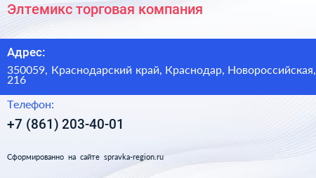 Элтемикс, торговая компания по адресу 350059, Краснодарский край, Краснодар, Новороссийская, 216 в дальнейшем Организация, размещена в следующих категориях: