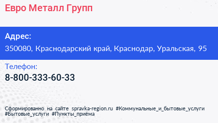 Евро Металл Групп по адресу 350080, Краснодарский край, Краснодар, Уральская, 95 в дальнейшем Организация, размещена в следующих категориях: