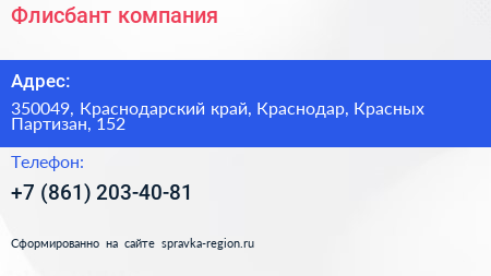 Флисбант, компания по адресу 350049, Краснодарский край, Краснодар, Красных Партизан, 152 в дальнейшем Организация, размещена в следующих категориях: