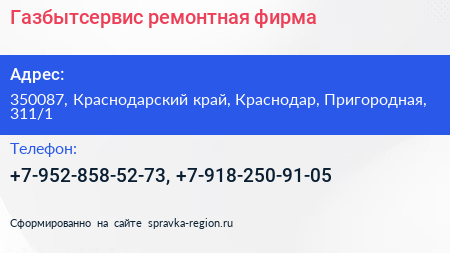 Газбытсервис, ремонтная фирма по адресу 350087, Краснодарский край, Краснодар, Пригородная, 311/1 в дальнейшем Организация, размещена в следующих категориях: