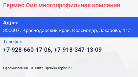 Гермес Оил, многопрофильная компания по адресу 350007, Краснодарский край, Краснодар, Захарова, 11а в дальнейшем Организация, размещена в следующих категориях: