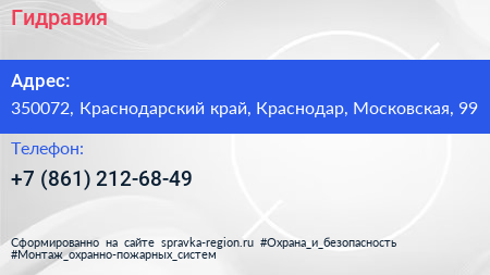 Гидравия по адресу 350072, Краснодарский край, Краснодар, Московская, 99 в дальнейшем Организация, размещена в следующих категориях: