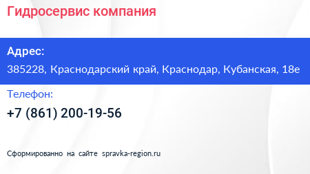 Гидросервис, компания по адресу 385228, Краснодарский край, Краснодар, Кубанская, 18е в дальнейшем Организация, размещена в следующих категориях: