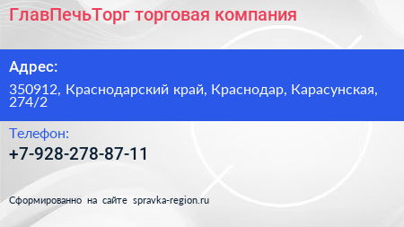 ГлавПечьТорг, торговая компания по адресу 350912, Краснодарский край, Краснодар, Карасунская, 274/2 в дальнейшем Организация, размещена в следующих категориях: