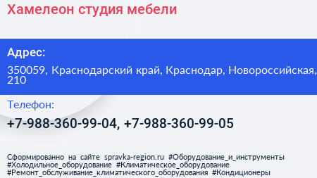 Хамелеон, студия мебели по адресу 350059, Краснодарский край, Краснодар, Новороссийская, 210 в дальнейшем Организация, размещена в следующих категориях: