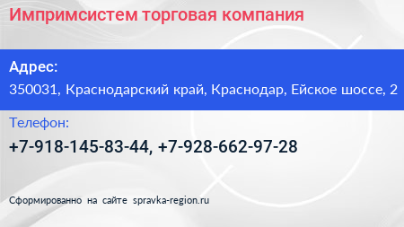 Импримсистем, торговая компания по адресу 350031, Краснодарский край, Краснодар, Ейское шоссе, 2 в дальнейшем Организация, размещена в следующих категориях: