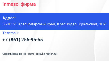Inmesol, фирма по адресу 350059, Краснодарский край, Краснодар, Уральская, 102 в дальнейшем Организация, размещена в следующих категориях: