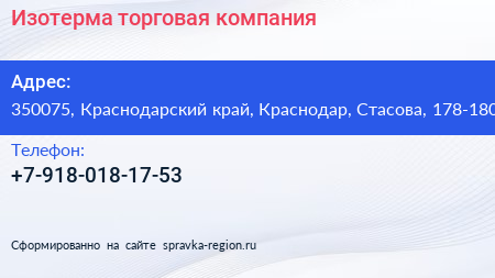Изотерма, торговая компания по адресу 350075, Краснодарский край, Краснодар, Стасова, 178-180 в дальнейшем Организация, размещена в следующих категориях: