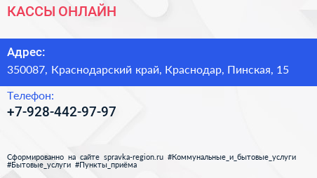 КАССЫ ОНЛАЙН по адресу 350087, Краснодарский край, Краснодар, Пинская, 15 в дальнейшем Организация, размещена в следующих категориях: