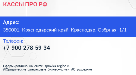 КАССЫ-ПРО.РФ по адресу 350001, Краснодарский край, Краснодар, Озёрная, 1/1 в дальнейшем Организация, размещена в следующих категориях: