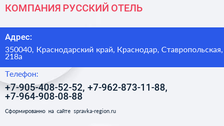 КОМПАНИЯ РУССКИЙ ОТЕЛЬ по адресу 350040, Краснодарский край, Краснодар, Ставропольская, 218а в дальнейшем Организация, размещена в следующих категориях: