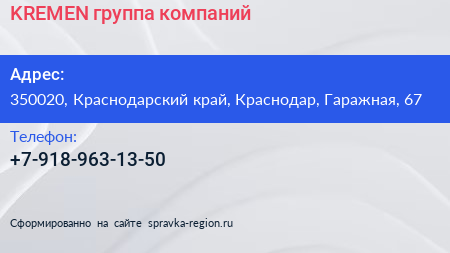 KREMEN, группа компаний по адресу 350020, Краснодарский край, Краснодар, Гаражная, 67 в дальнейшем Организация, размещена в следующих категориях: