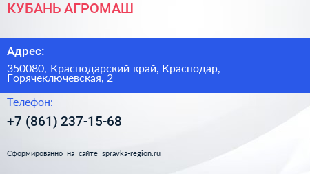 КУБАНЬ-АГРОМАШ по адресу 350080, Краснодарский край, Краснодар, Горячеключевская, 2 в дальнейшем Организация, размещена в следующих категориях:
