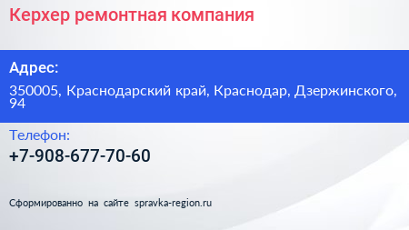 Керхер, ремонтная компания по адресу 350005, Краснодарский край, Краснодар, Дзержинского, 94 в дальнейшем Организация, размещена в следующих категориях: