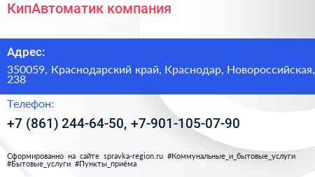 КипАвтоматик, компания по адресу 350059, Краснодарский край, Краснодар, Новороссийская, 238 в дальнейшем Организация, размещена в следующих категориях: