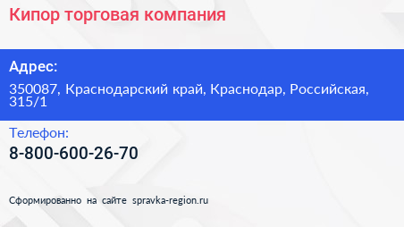 Кипор, торговая компания по адресу 350087, Краснодарский край, Краснодар, Российская, 315/1 в дальнейшем Организация, размещена в следующих категориях: