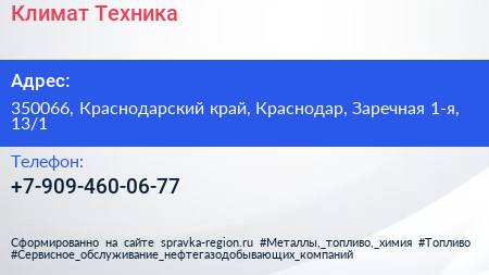 Климат Техника по адресу 350066, Краснодарский край, Краснодар, Заречная 1-я, 13/1 в дальнейшем Организация, размещена в следующих категориях: