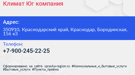 Климат Юг, компания по адресу 350910, Краснодарский край, Краснодар, Бородинская, 156 к3 в дальнейшем Организация, размещена в следующих категориях: